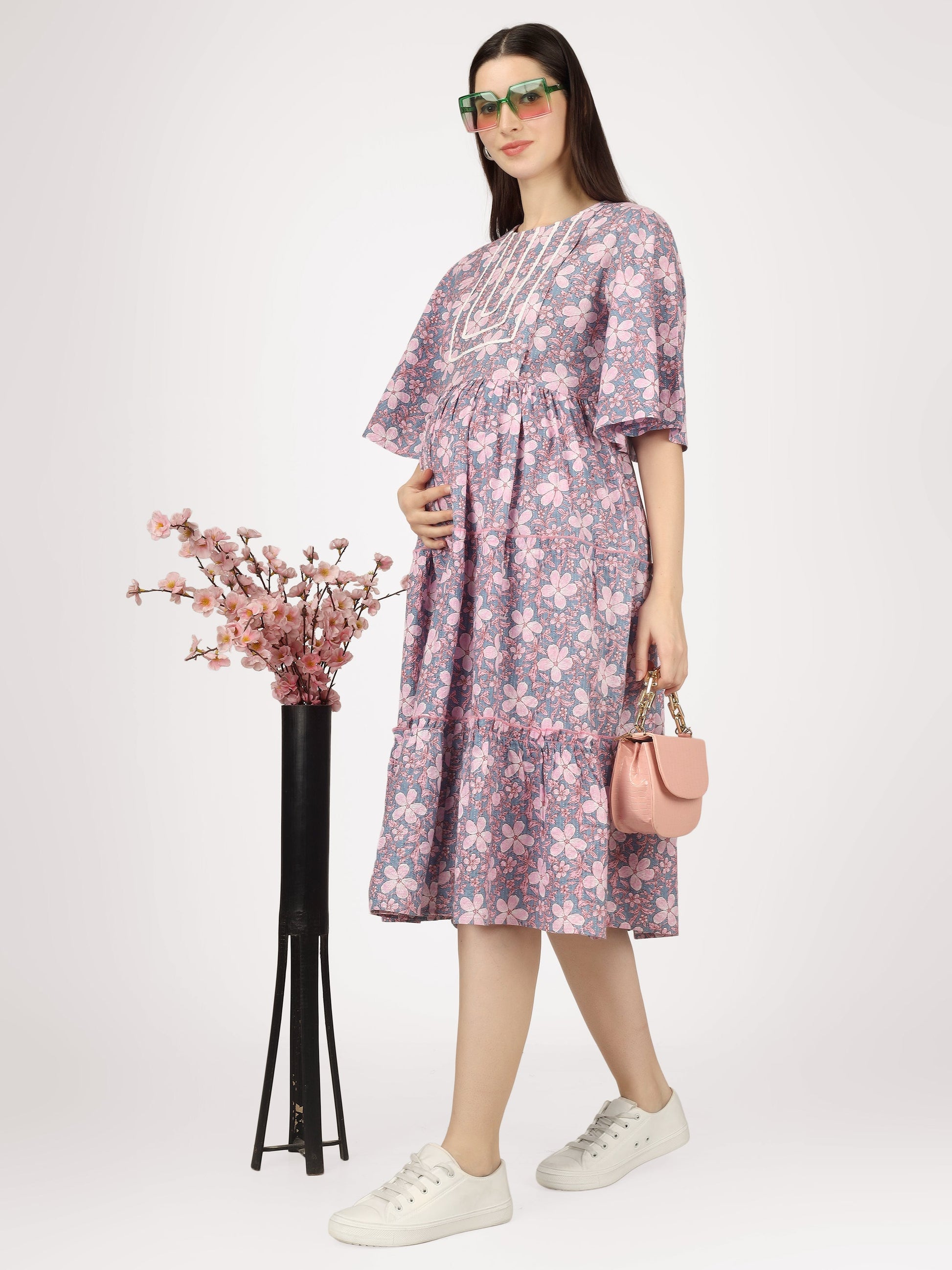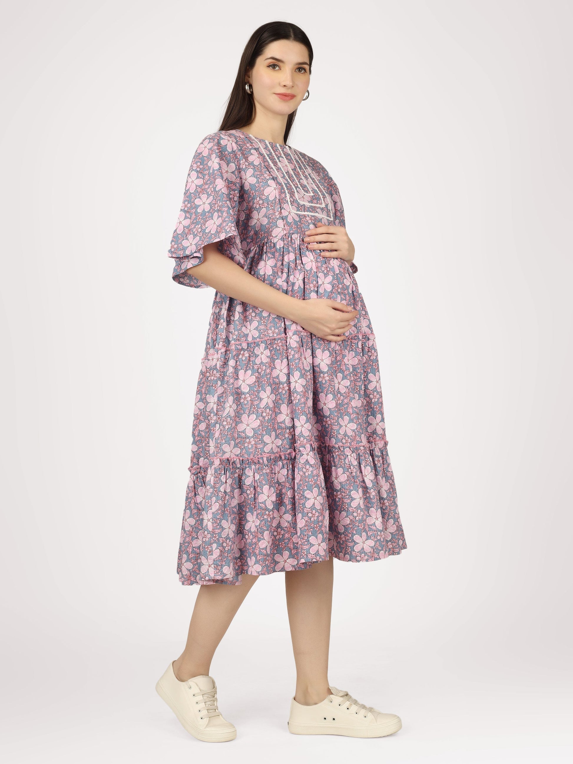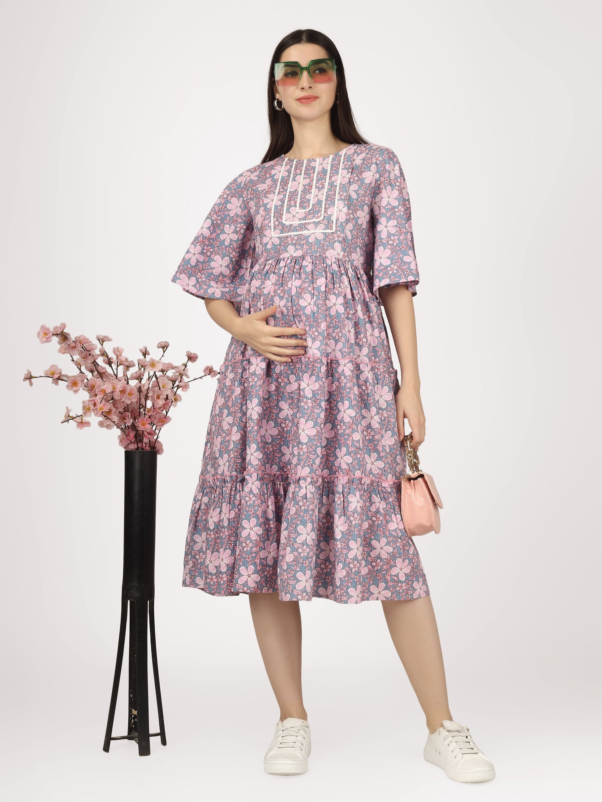 Effortlessly transition from work to play with our First Love Lilac Cotton Maternity Dress. Designed with a delicate lilac and white print, this A-line dress features a round neck, three quarter flared sleeves, and lace-up and tiered detail. Made with 100% cotton fabric, it provides both style and comfort. Conveniently concealed zip closure in the front makes it perfect for office wear.