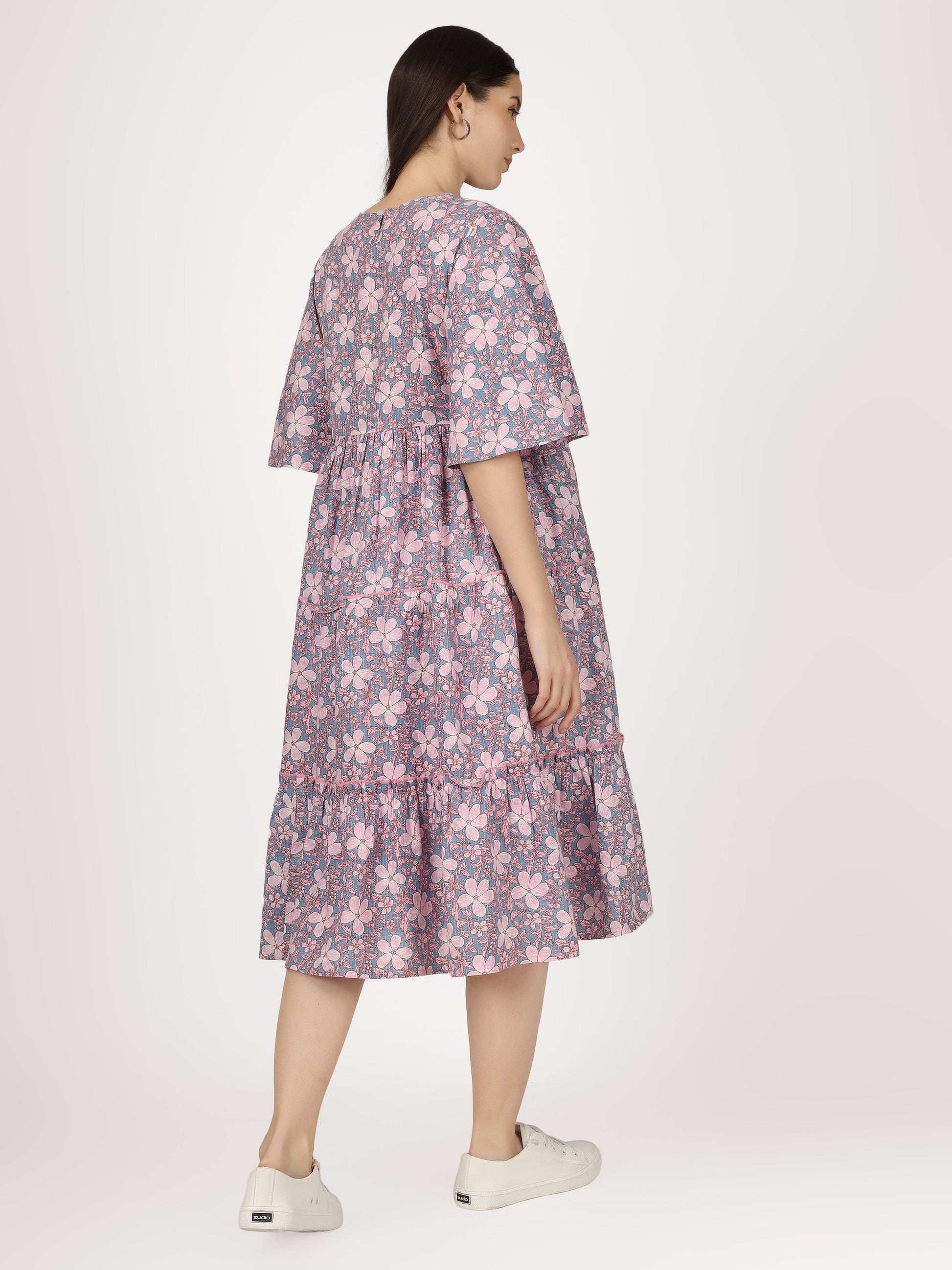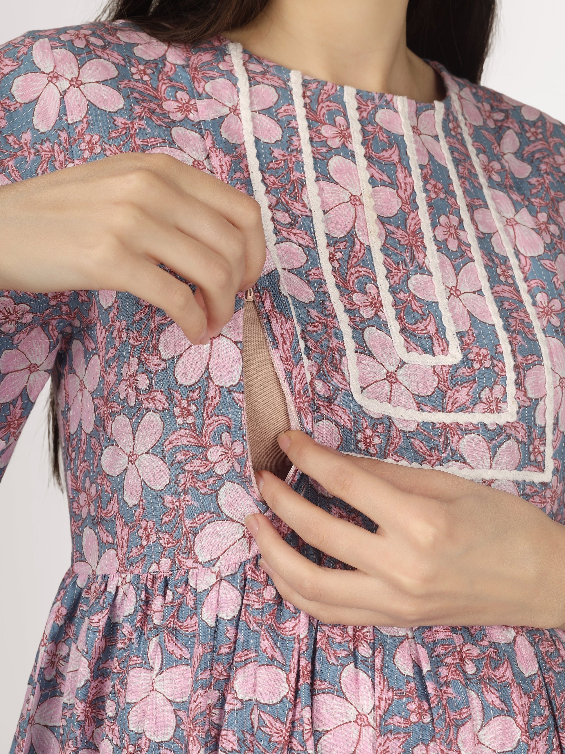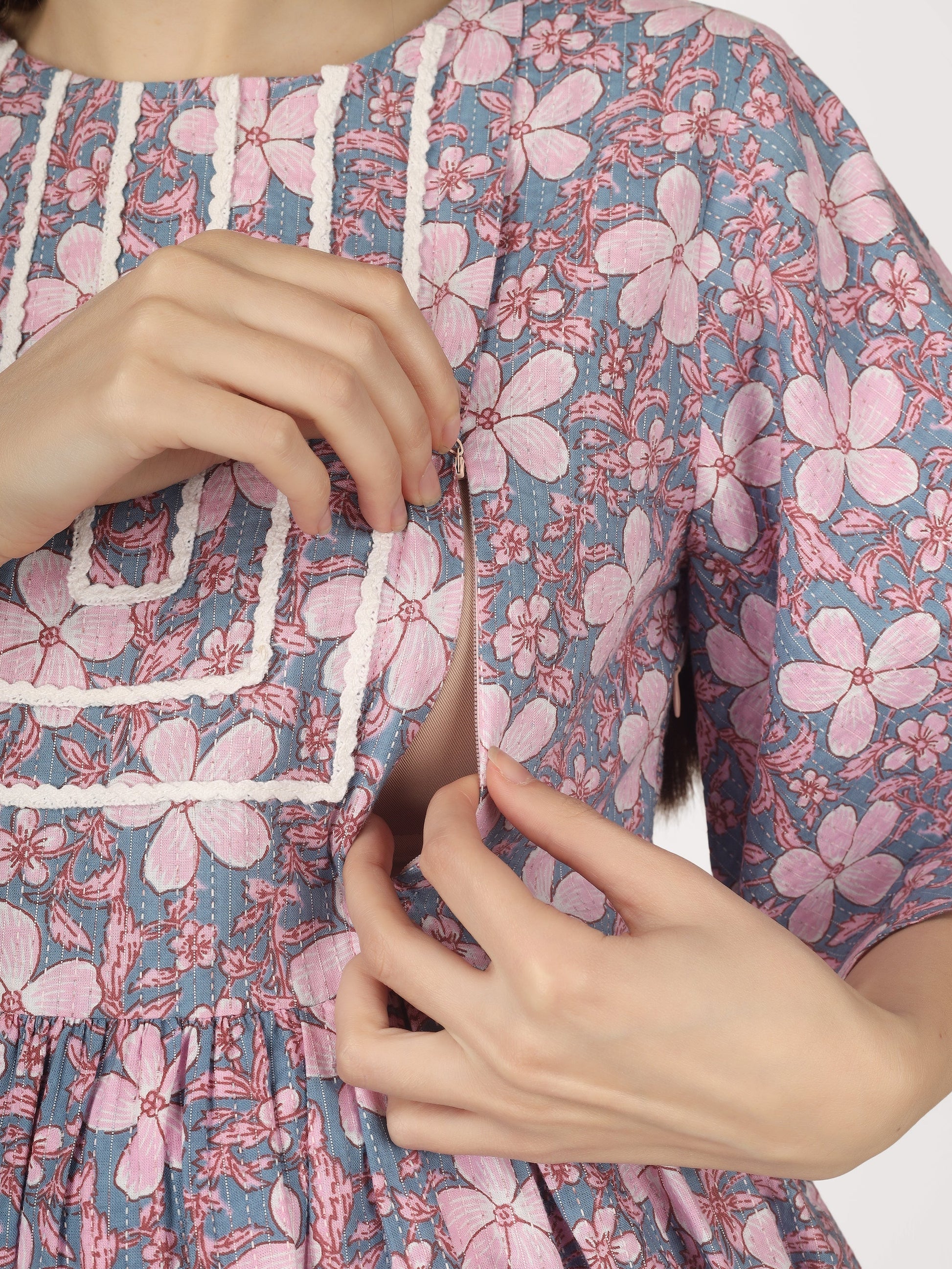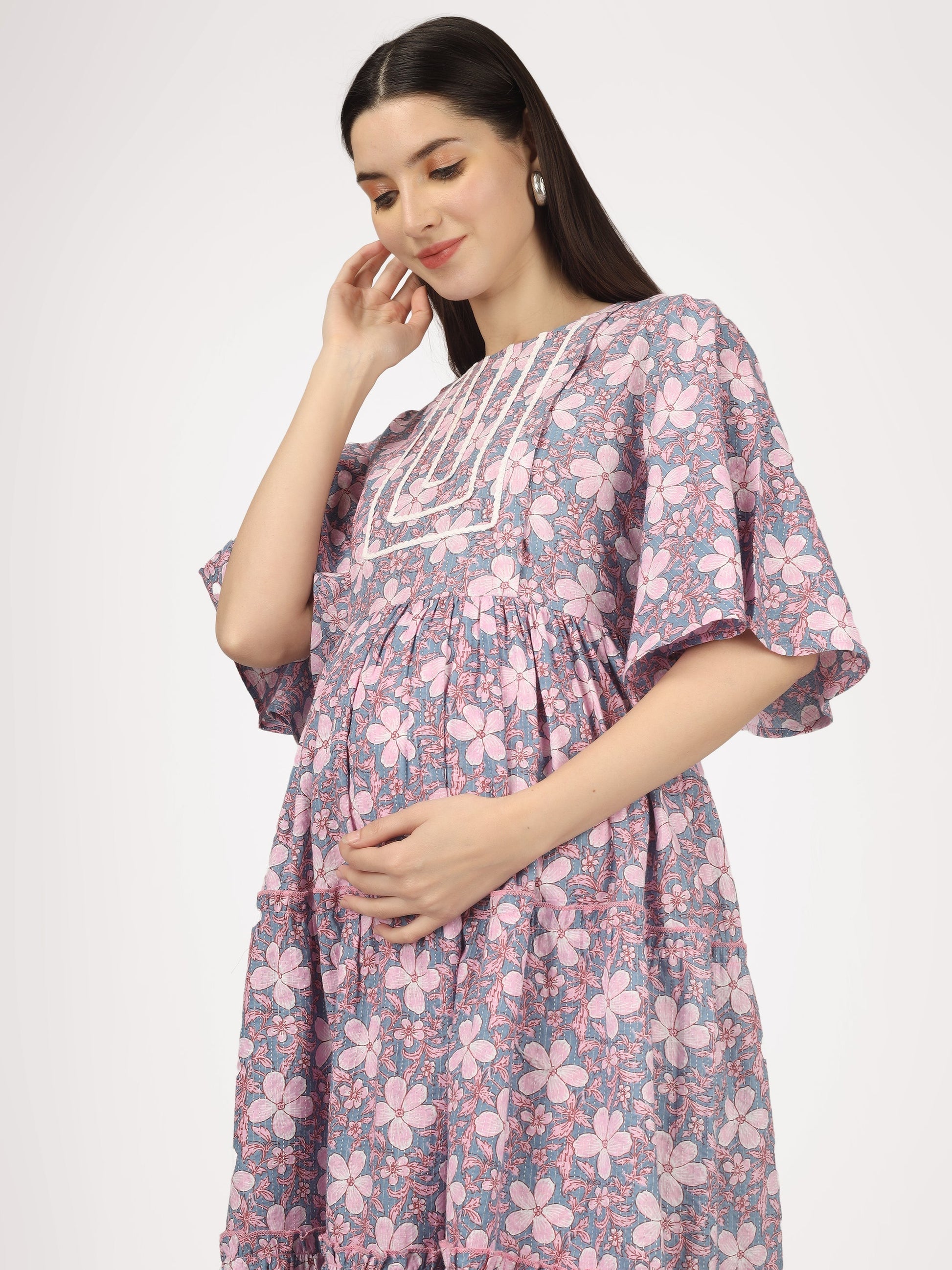 Effortlessly transition from work to play with our First Love Lilac Cotton Maternity Dress. Designed with a delicate lilac and white print, this A-line dress features a round neck, three quarter flared sleeves, and lace-up and tiered detail. Made with 100% cotton fabric, it provides both style and comfort. Conveniently concealed zip closure in the front makes it perfect for office wear.