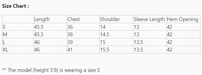 Length | Chest | Shoulder | Sleeve Length | Hem Opening | |