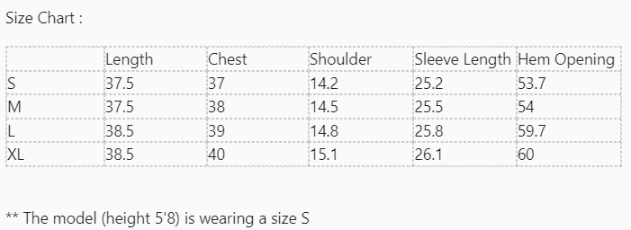 | Length | Chest | Shoulder | Sleeve Length | Hem Opening | |