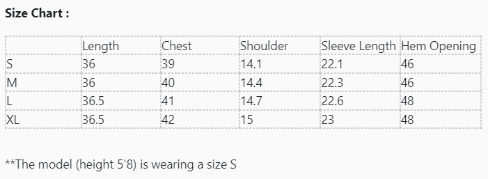 | Length | Chest | Shoulder | Sleeve Length | Hem Opening | |